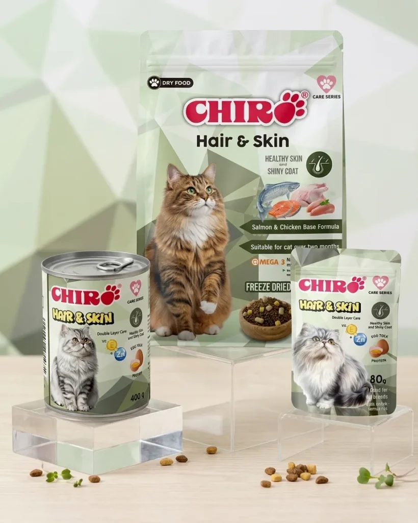 Chiro Cat Food diformulasikan untuk membantu menjaga kesehatan kulit dan bulu kucing dengan nutrisi seimbang setiap hari.