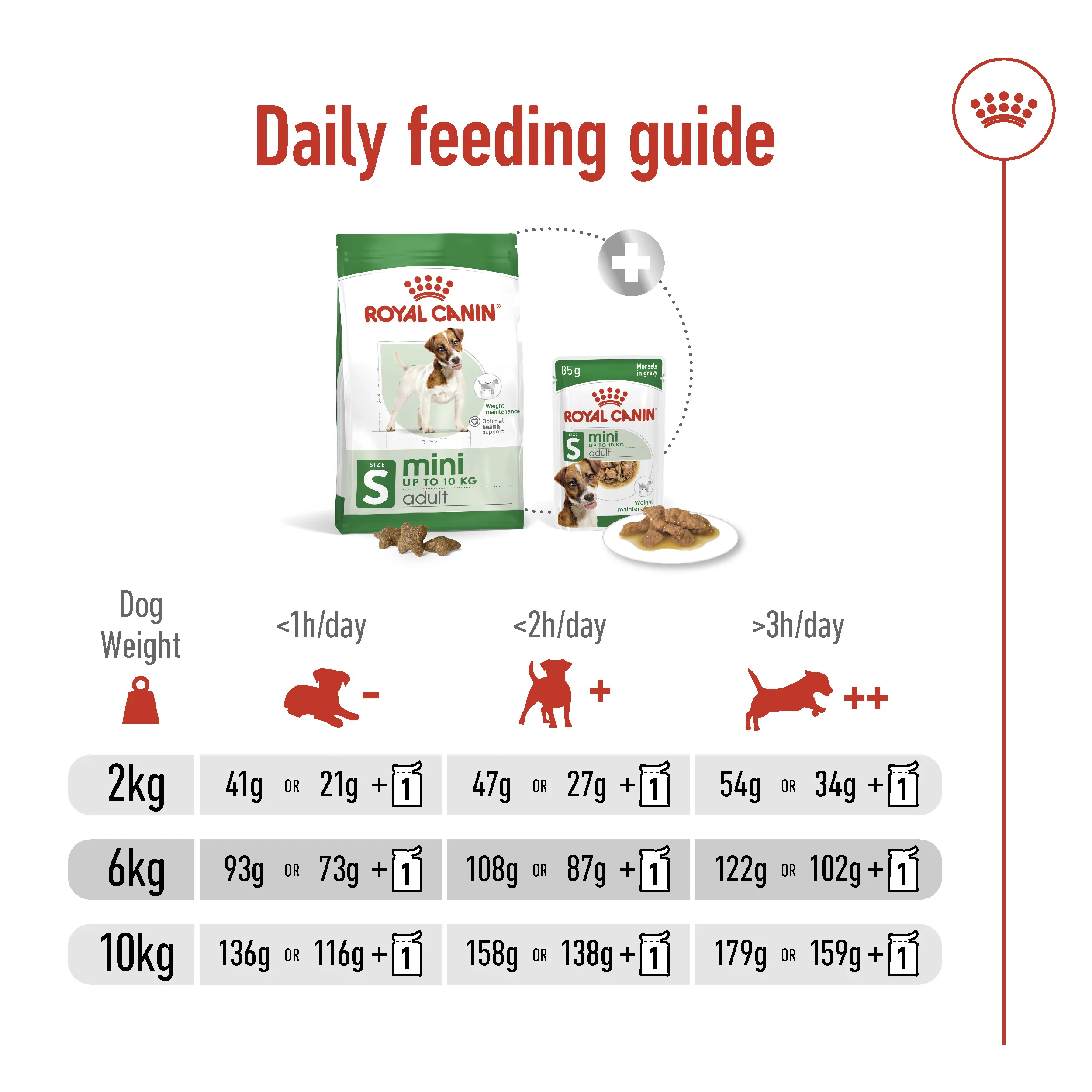 ROYAL CANIN® Mini Adult juga tersedia dalam bentuk makanan basah, potongan daging alami dalam kaldu. Campurkan makanan basah dan kering untuk pengalaman makanan yang lebih optimal dari segi tekstur, aroma, dan rasa. Membuat waktu makan mereka lebih menarik dan menggugah. Kibble kering memberikan efek gosok gigi saat dikunyah hal ini bertujuan untuk menjaga kesehatan gigi, sedangkan kandungan air yang tinggi dalam makanan basah membantu anjing anda tetap terhidrasi dan dapat menjaga kesehatan perkemihannya.