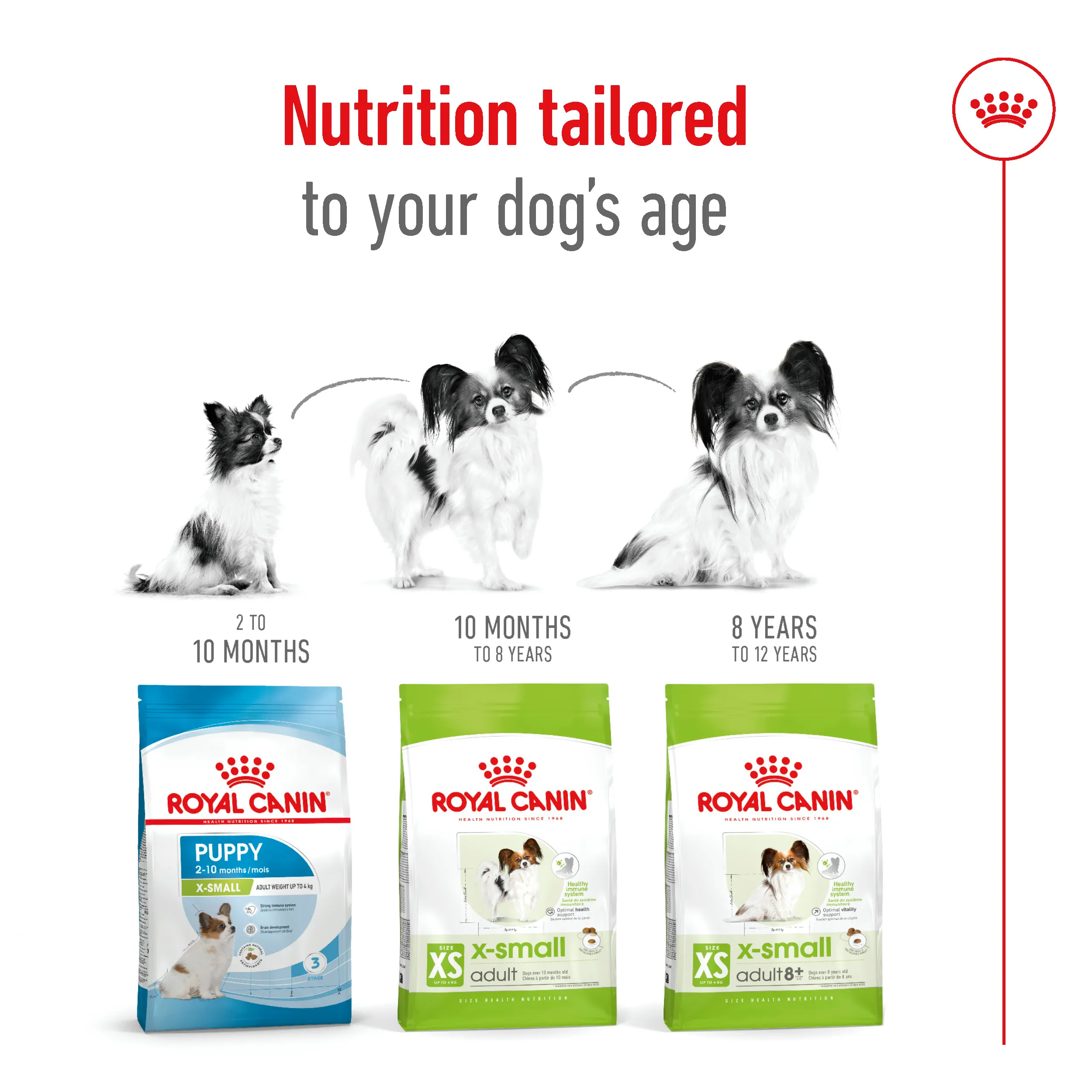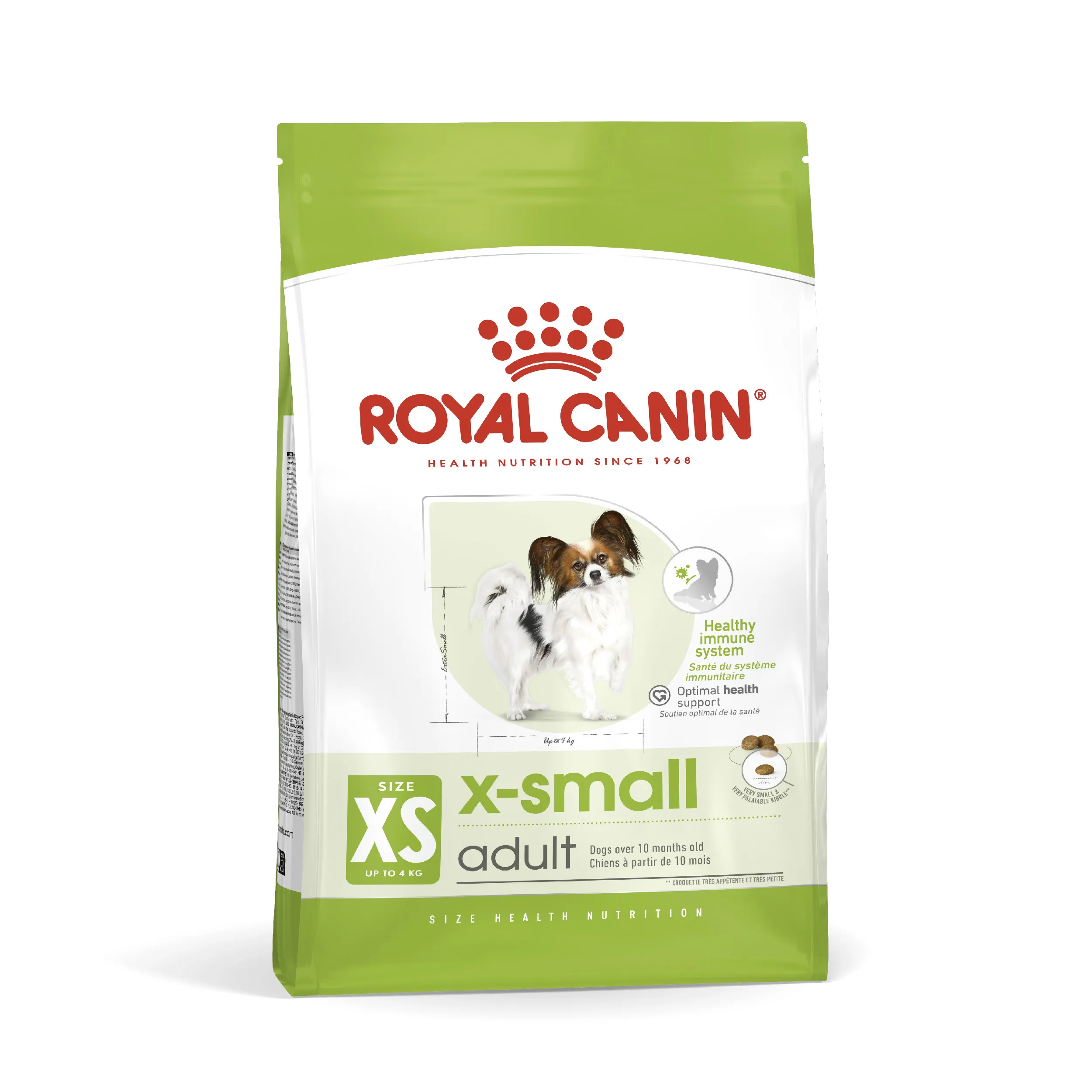 ROYAL CANIN® X-Small Adult memiliki formula yang kaya akan nutrien ini dirancang dengan nutrien-nutrien esensial seperti EPA, DHA, dan vitamin C, yang berguna untuk membantu memelihara sistem imun dan kesehatan keseluruhan anjing mungil anda. Pada tahapan kehidupan ini, anjing berukuran sangat kecil membutuhkan nutrien tertentu untuk membantu mereka tetep aktif, sehat, dan penuh keceriaan. Formula ini diperkaya dengan protein berdaya cerna tinggi untuk penyerapan yang maksimal dan dukungan kesehatan yang optimal. Anjing berukuran sangat kecil terkenal dengan sifatnya yang pemilih makanan. Makanan ini tidak hanya memiliki aroma yang wangi, namun juga memiliki ukuran kibble sangat kecil yang sudah disesuaikan dengan struktur rahang mungilnya, sehingga perpaduan aroma dan teknologi kibble ini diharapkan dapat meningkatkan nafsu makan mereka bahkan untuk anjing paling pemilih sekalipun. Rahang yang begitu mungil membuat susunan gigi di dalamnya begitu rapat sehingga membuat makanan sisa mudah menyelip dan dapat berkembang menjadi karang gigi, berkat kandungan pengikat kalsium, makanan ini dapat membantu mengurangi pembentukan karang gigi.