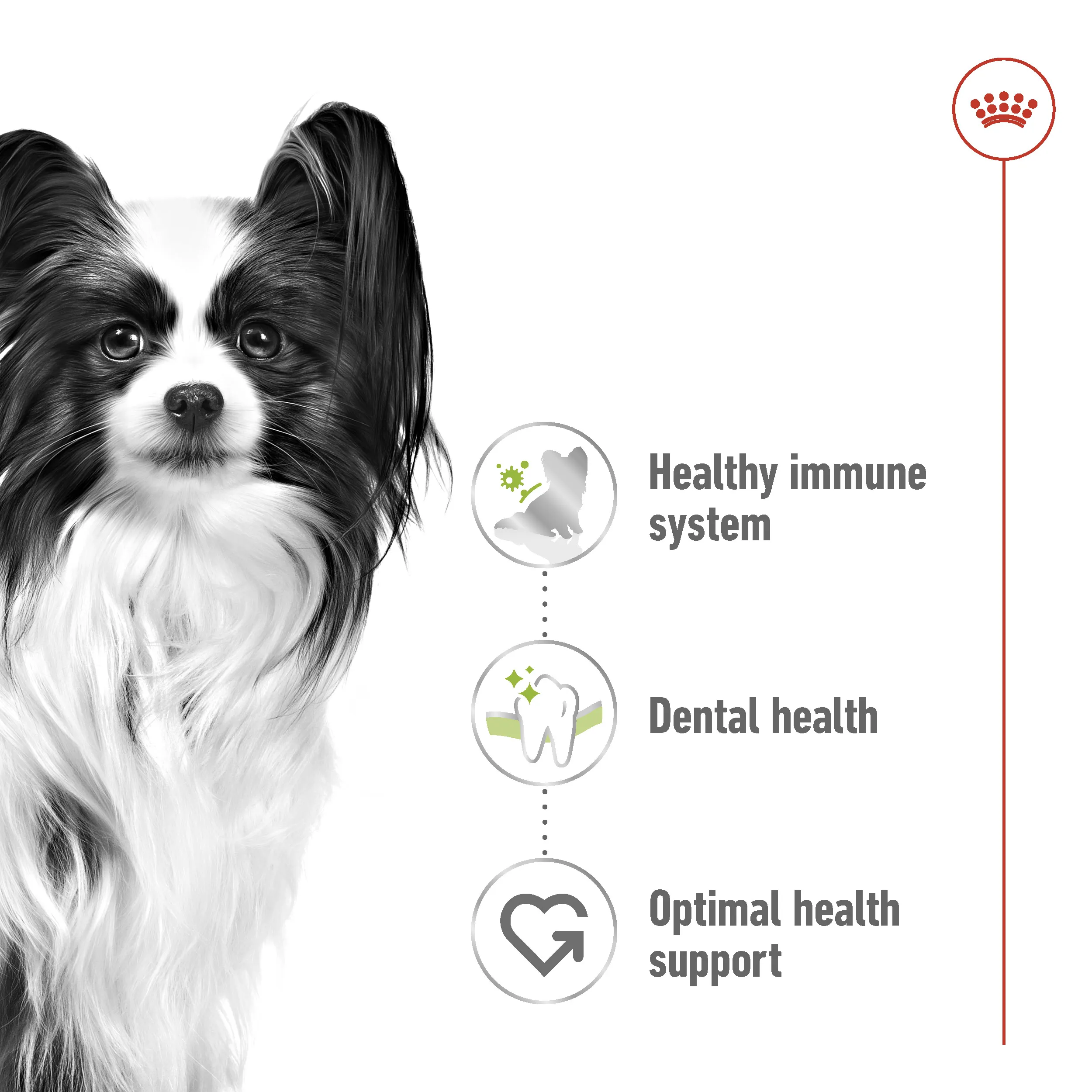 Anjing berukuran sangat kecil memiliki rahang & mulut yang mungil sehingga susunan giginya sangat rapat, hal ini dapat berujung pada penumpukkan sisa makanan dan masalah karang gigi dikemudian hari. Formula nutrisi dalam makanan ini dapat membantu mengurangi pembentukan karang gigi berkat kandungan pengikat kalsium.