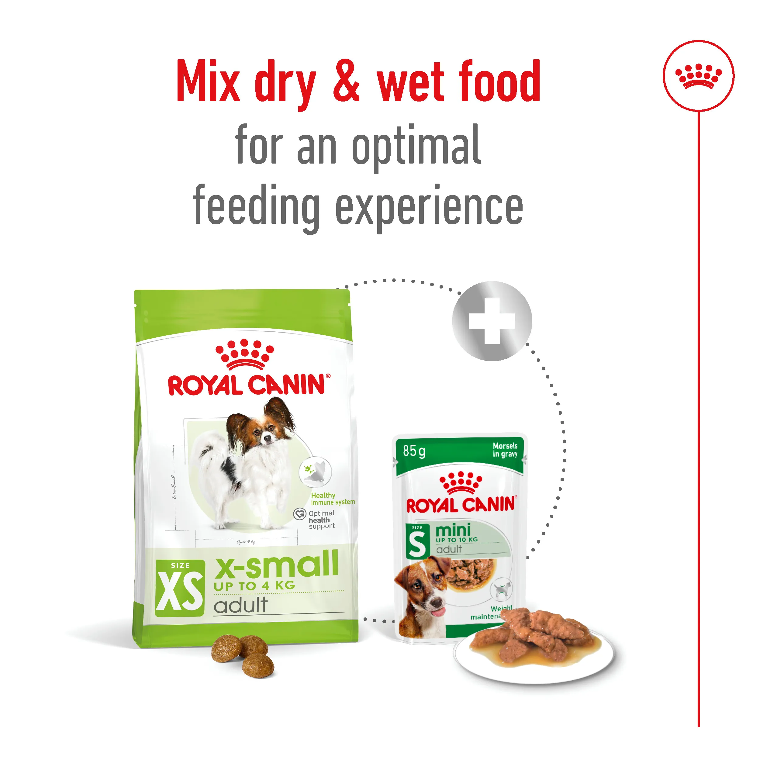 Untuk pengalaman makan yang optimal, anda dapat mencampurkan makanan kering ROYAL CANIN® X-Small Adult dengan makanan basah ROYAL CANIN® Mini Adult potongan daging alami dalam kaldu . Pencampuran makanan ini akan menciptakan pengalaman makan yang lebih menarik dan menggugah selera. Kibble kering memberikan efek gosok gigi saat dikunyah hal ini bertujuan untuk menjaga kesehatan gigi, sedangkan kandungan air yang tinggi dalam makanan basah membantu anjing anda tetap terhidrasi dan dapat menjaga kesehatan perkemihannya.