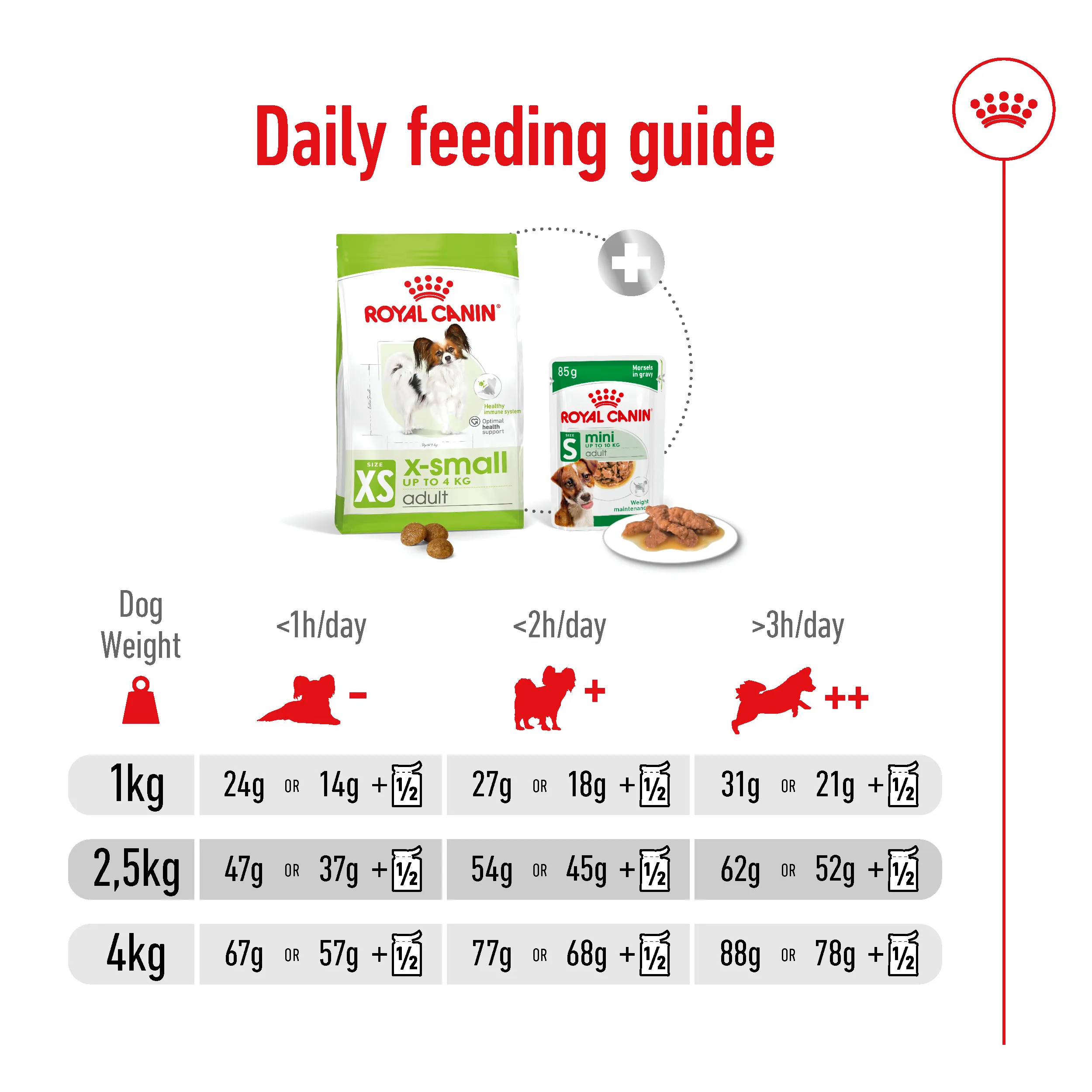 Anjing berukuran sangat kecil merupakan anjing yang memiliki kepribadian ceria dan penuh pesona, namun ternyata mereka memiliki kebutuhan nutrisi yang spesifik sesuai dengan masalah kesehatan spesifiknya. ROYAL CANIN® X-Small Adult memiliki formula nutrisi yang lengkap & seimbang yang dirancang khusus untuk memenuhi kebutuhan anjing ras sangat kecil dan mendukung mereka dalam menghadapi tahap usia dewasa. Makanan ini cocok untuk anjing berukuran sangat kecil di usia lebih dari 10 bulan dan berat badan hingga 4kg.