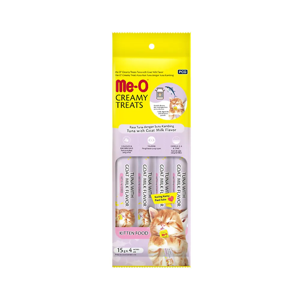*Catatan: Me-O Creamy Treats hanya boleh diberikan sebagai camilan. Untuk memenuhi kebutuhan nutrisi kucing sehari-hari, tetap berikan makanan utamanya.