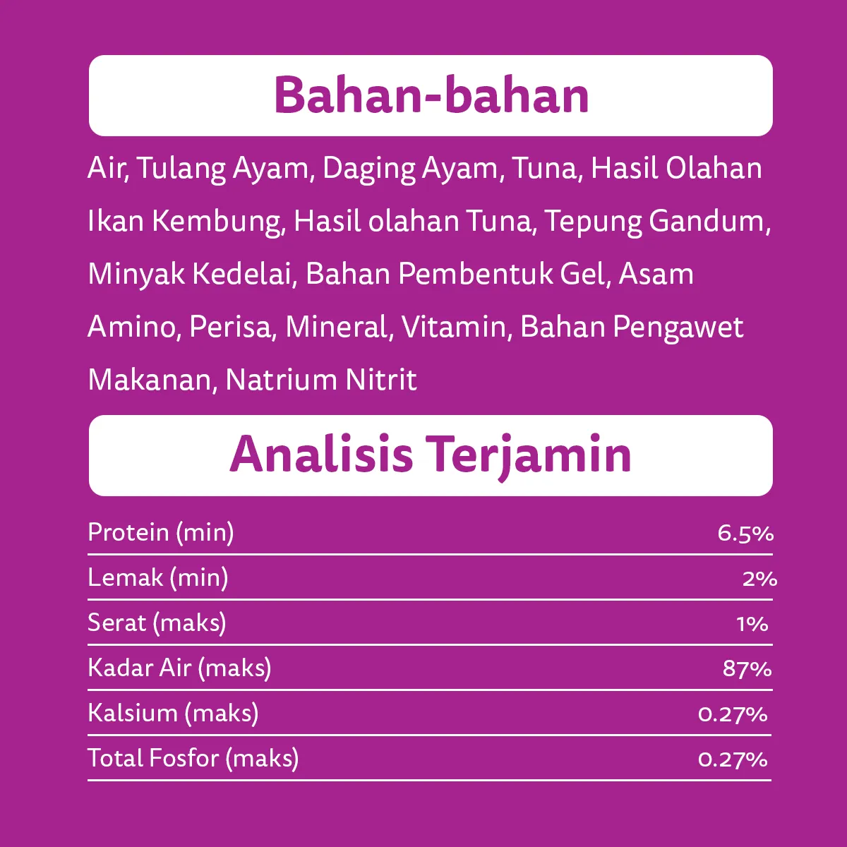 • 100% NUTRISI LENGKAP DAN SEIMBANG – Makanan kucing basah ini mengandung 100% nutrisi yang lengkap dan seimbang untuk kucing usia 1+ tahun